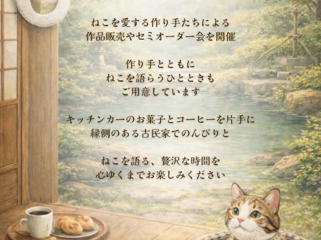 猫をテーマにしたハンドメイド作品や、ゆったりとした時間を楽しみたい方は、足を運んでみてはいかがでしょうか。